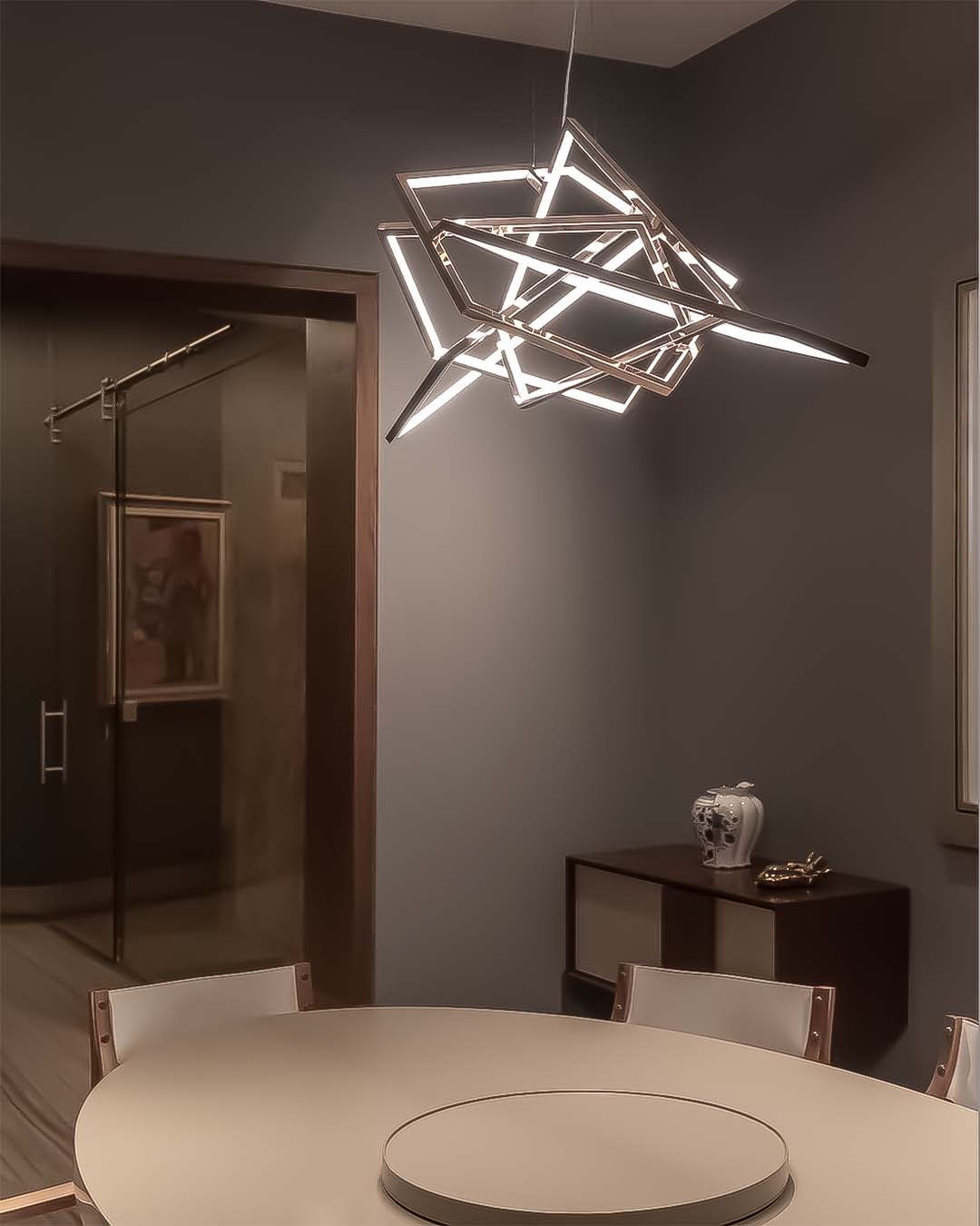 Apolo is complex and disruptive. Four linked polygons form a daring and leading design. Made by hand in stainless steel, it combines metal with an internal light edge. Its structure is ideal for a prominent space.