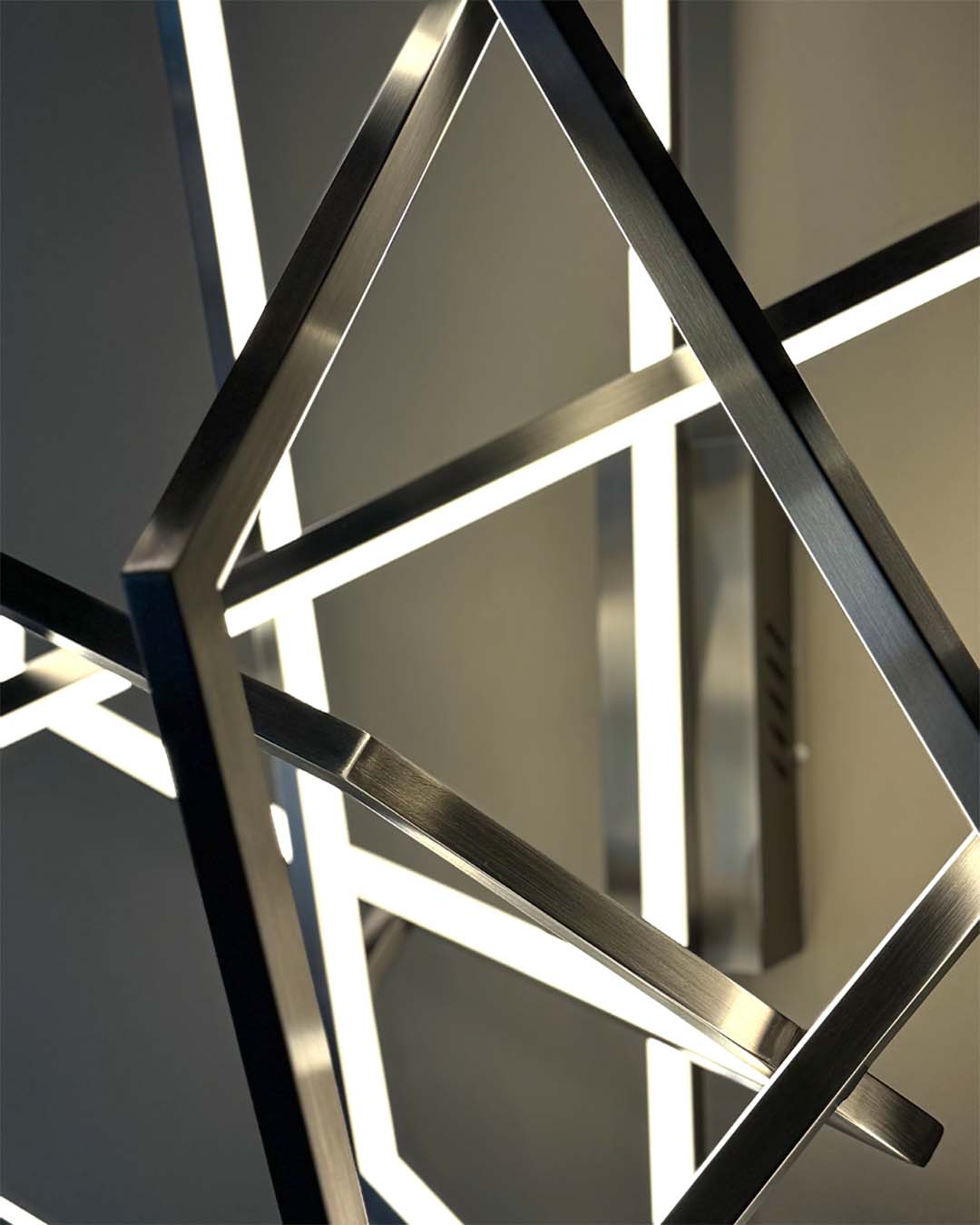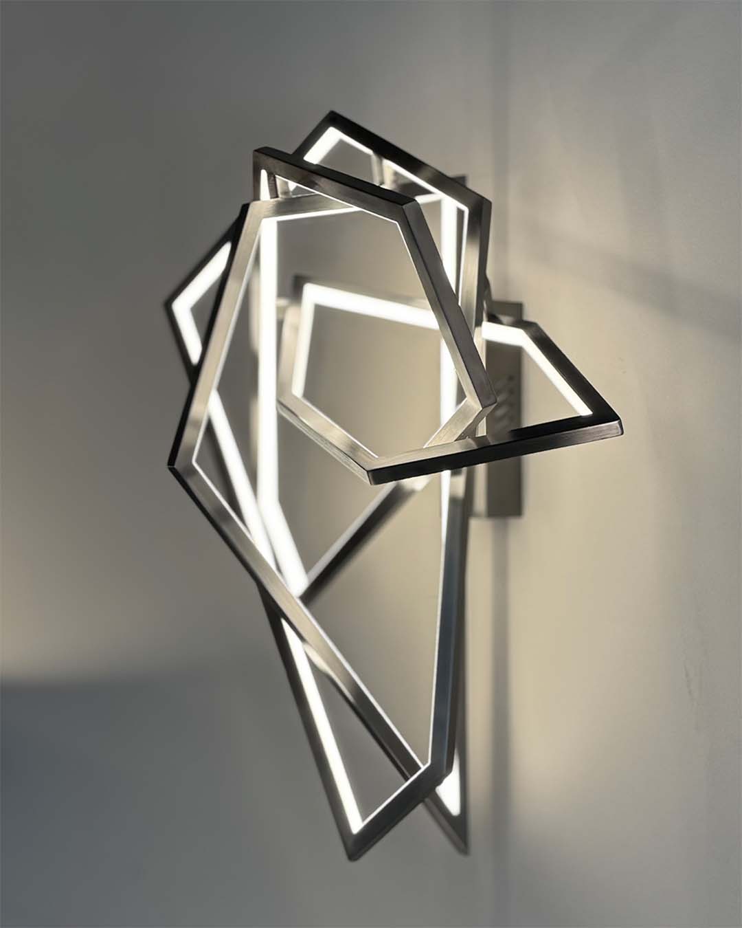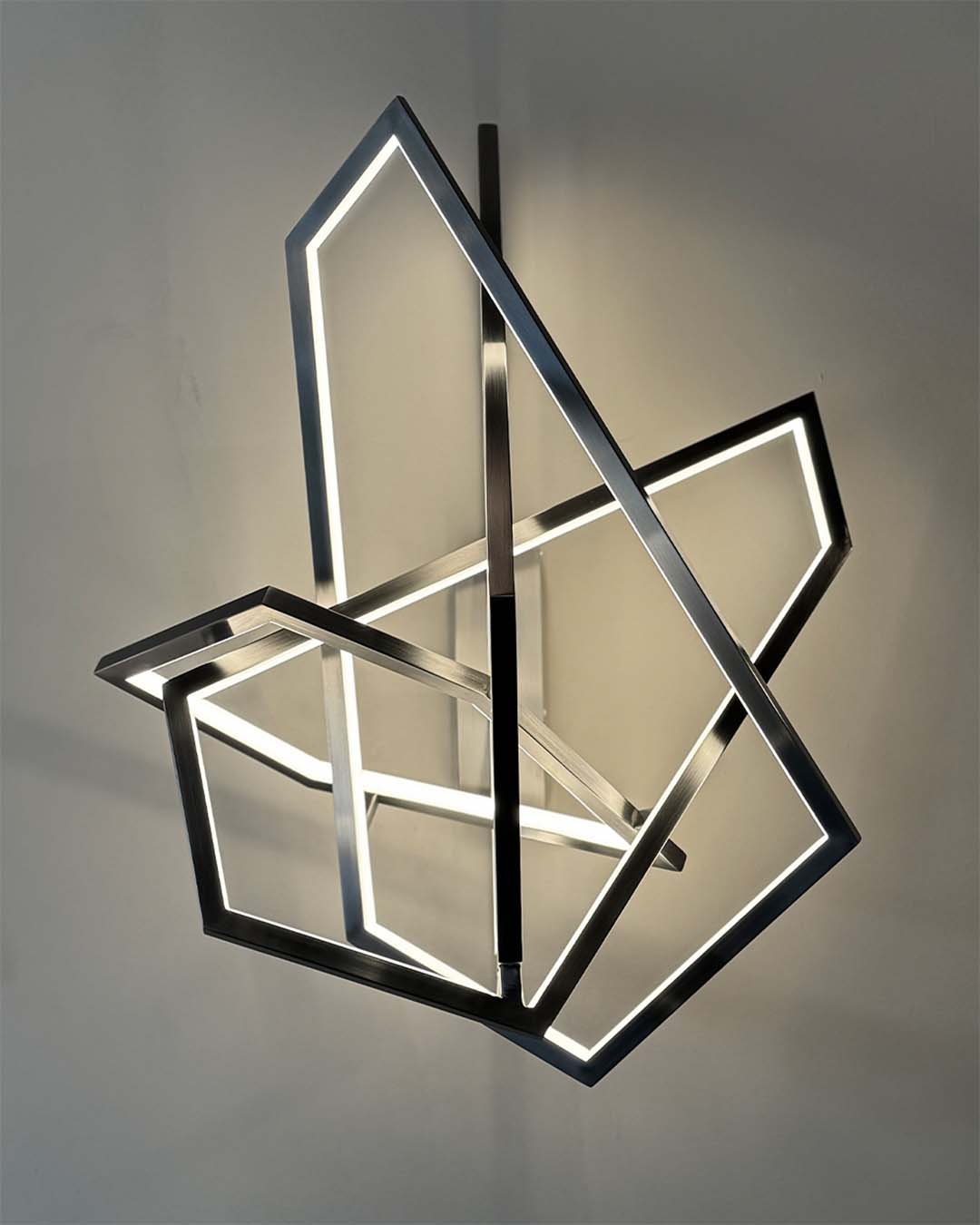 Apolo is complex and disruptive. Four linked polygons form a daring and leading design. Made by hand in stainless steel, it combines metal with an internal light edge. Its structure is ideal for a prominent space.