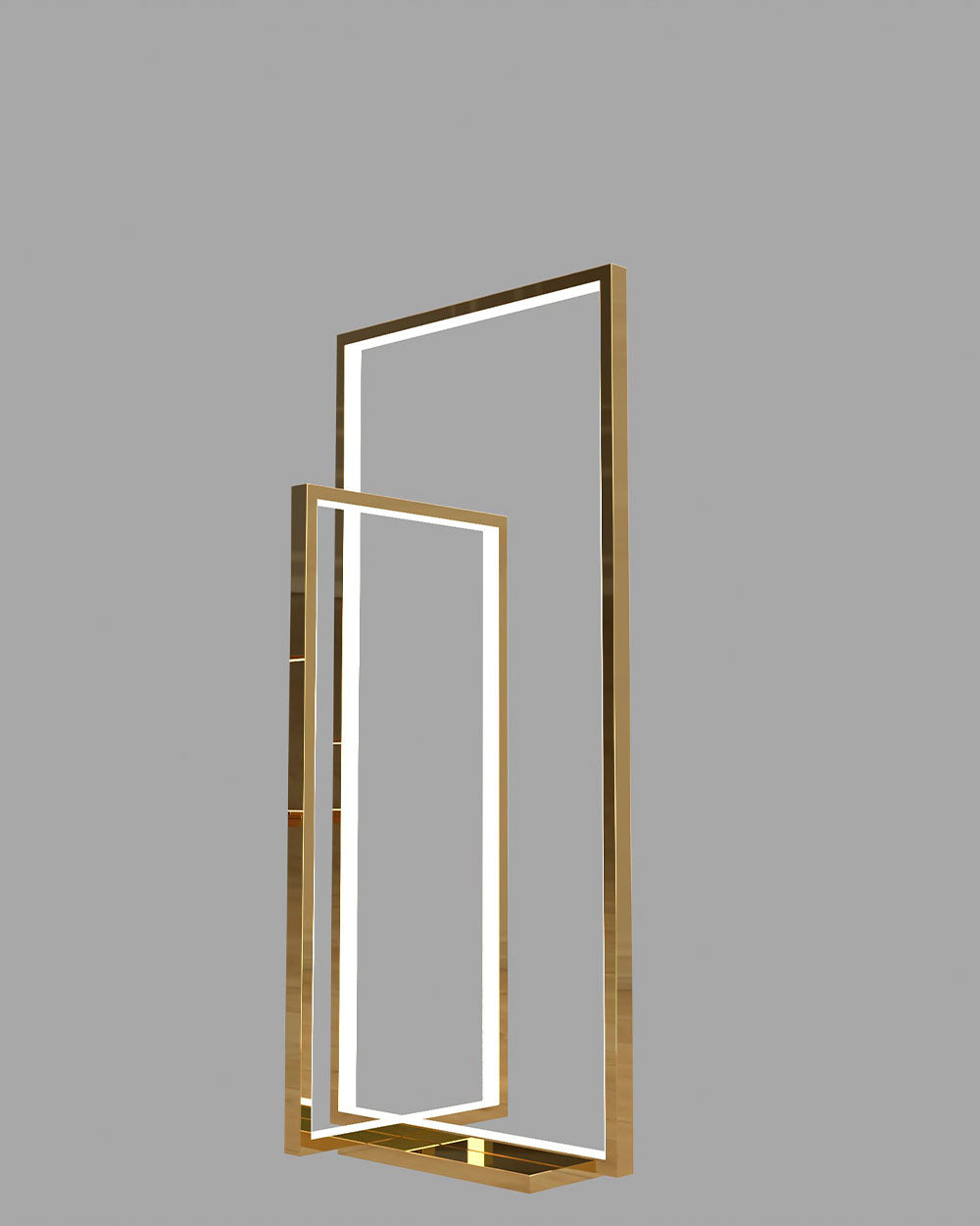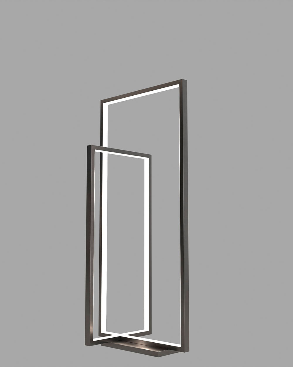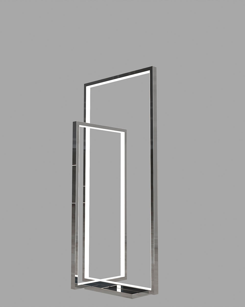 A geometric sculpture formed by interlocking rectangles of light suspended in the air. Its minimalism is only comparable to the originality of its design. Its charm is centered