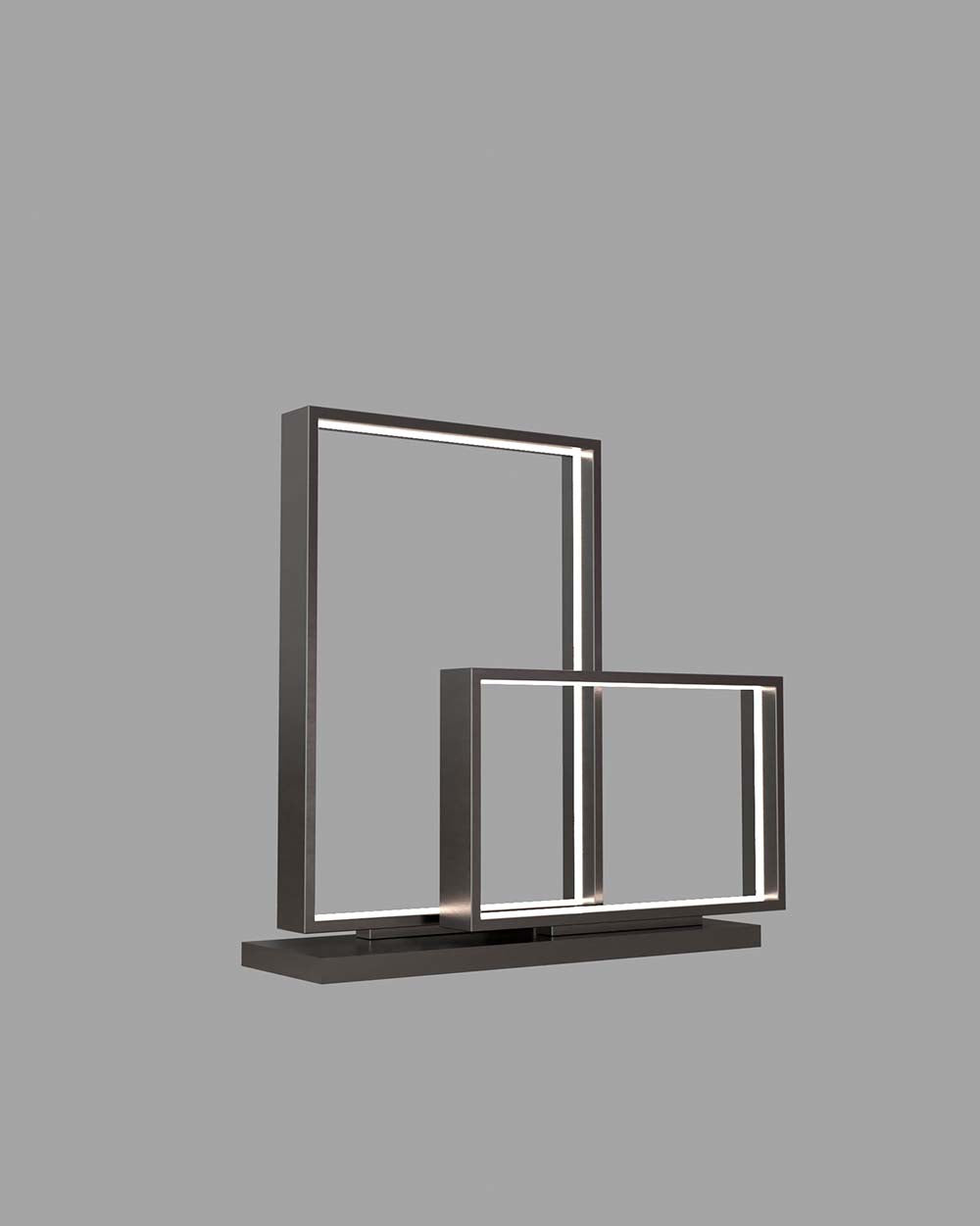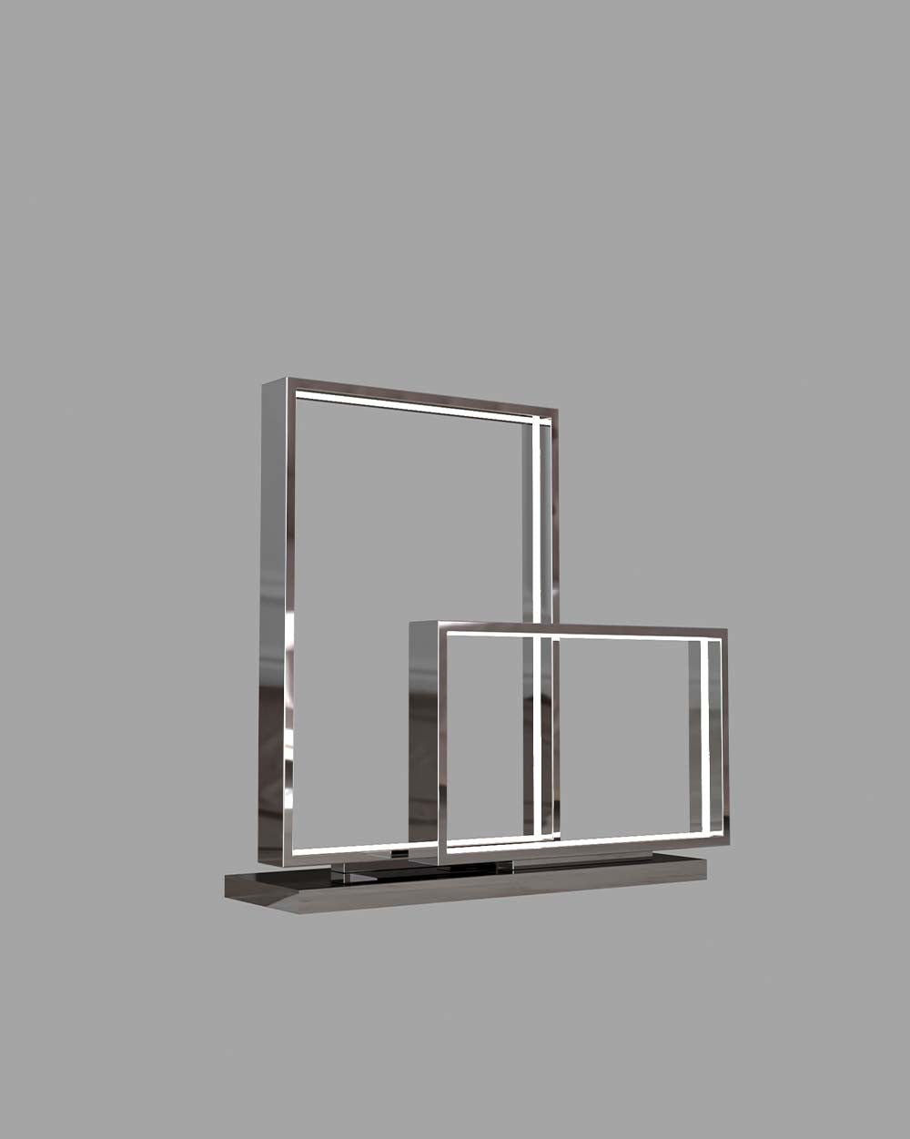 A geometric sculpture formed by interlocking rectangles of light suspended in the air. Its minimalism is only comparable to the originality of its design. Its charm is centered