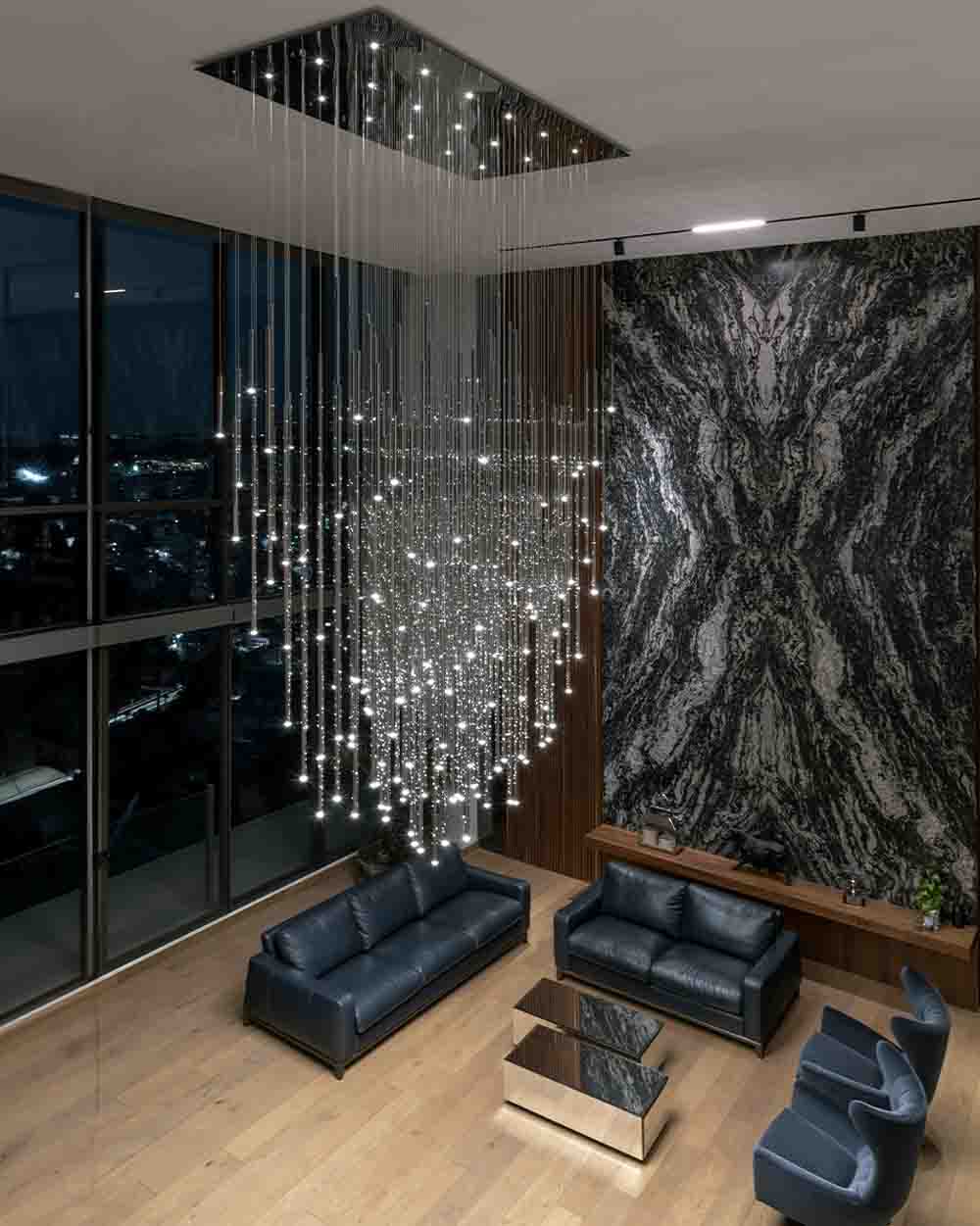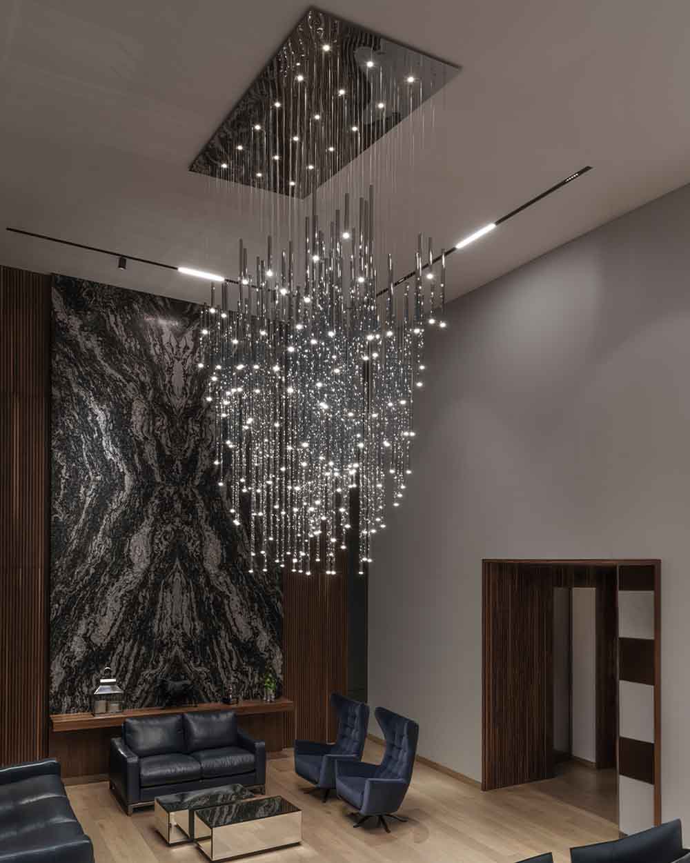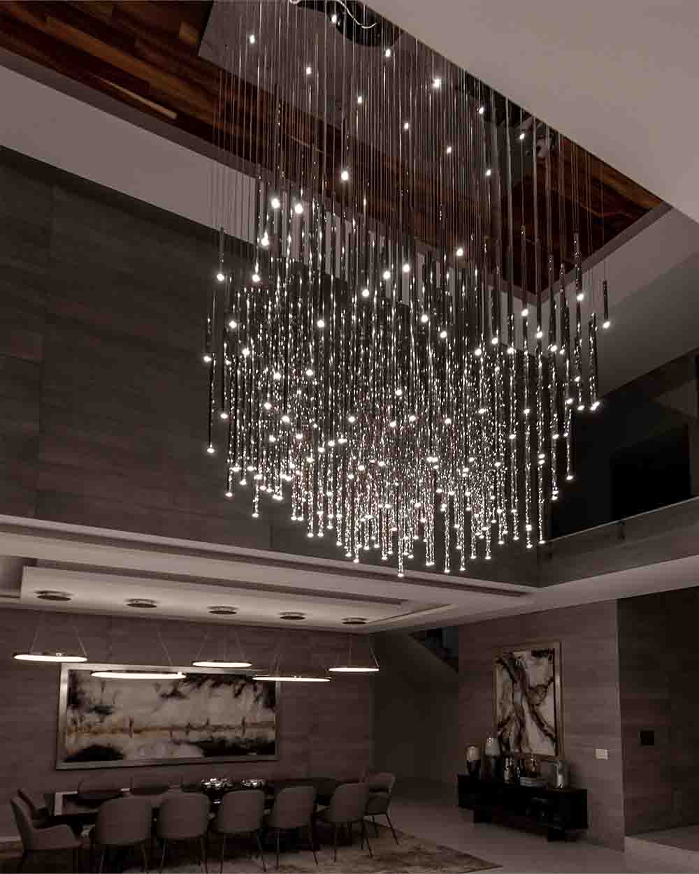 A majestic and imposing lighting design. A shower of rods of different sizes dresses up high-ceilinged environments. With its versatility and multiple configurations, both in the