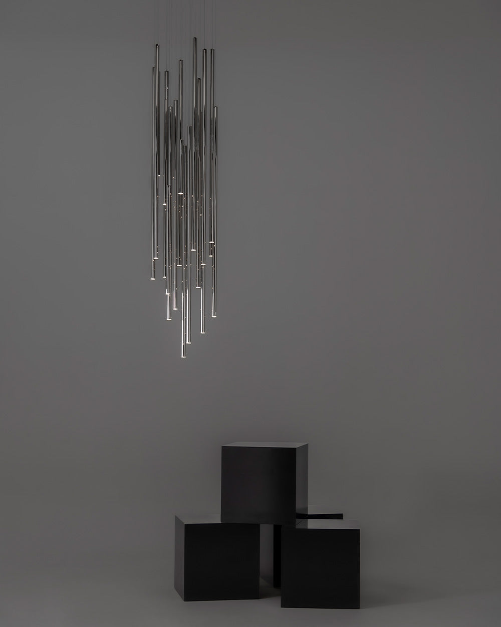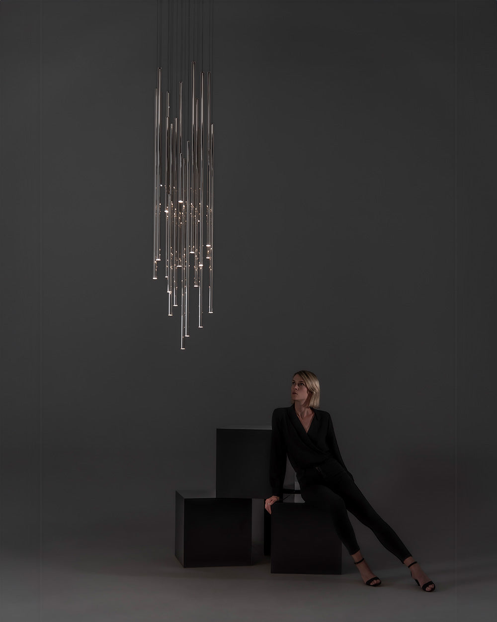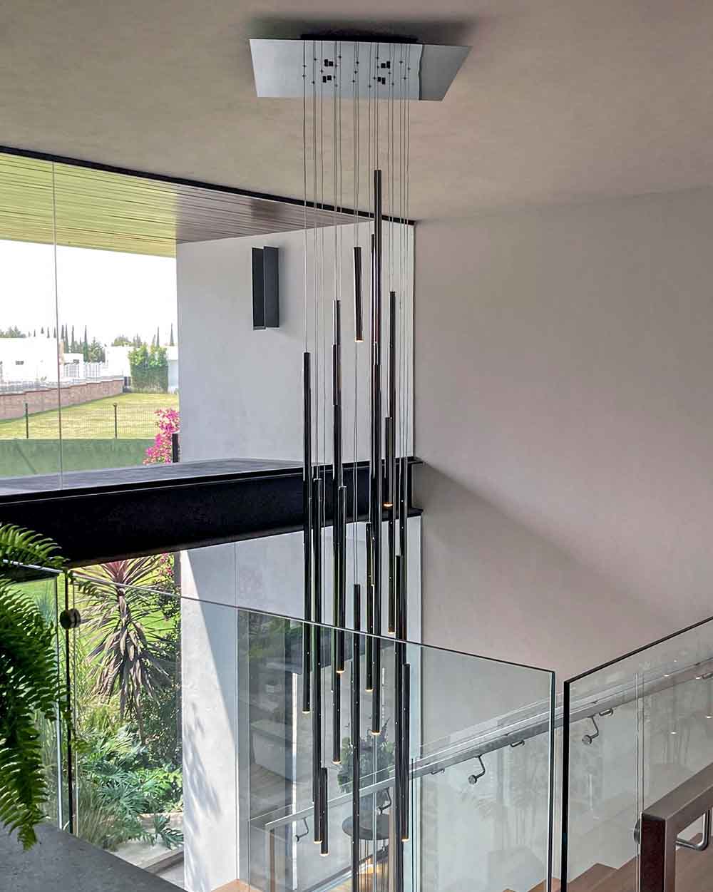 A majestic and imposing lighting design. A shower of rods of different sizes dresses up high-ceilinged environments. With its versatility and multiple configurations, both in the