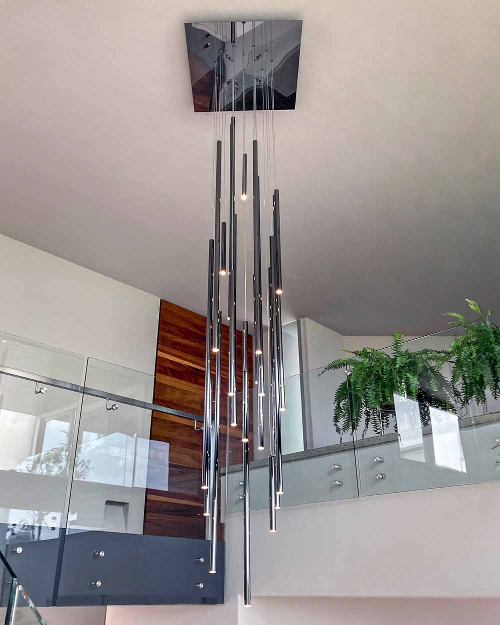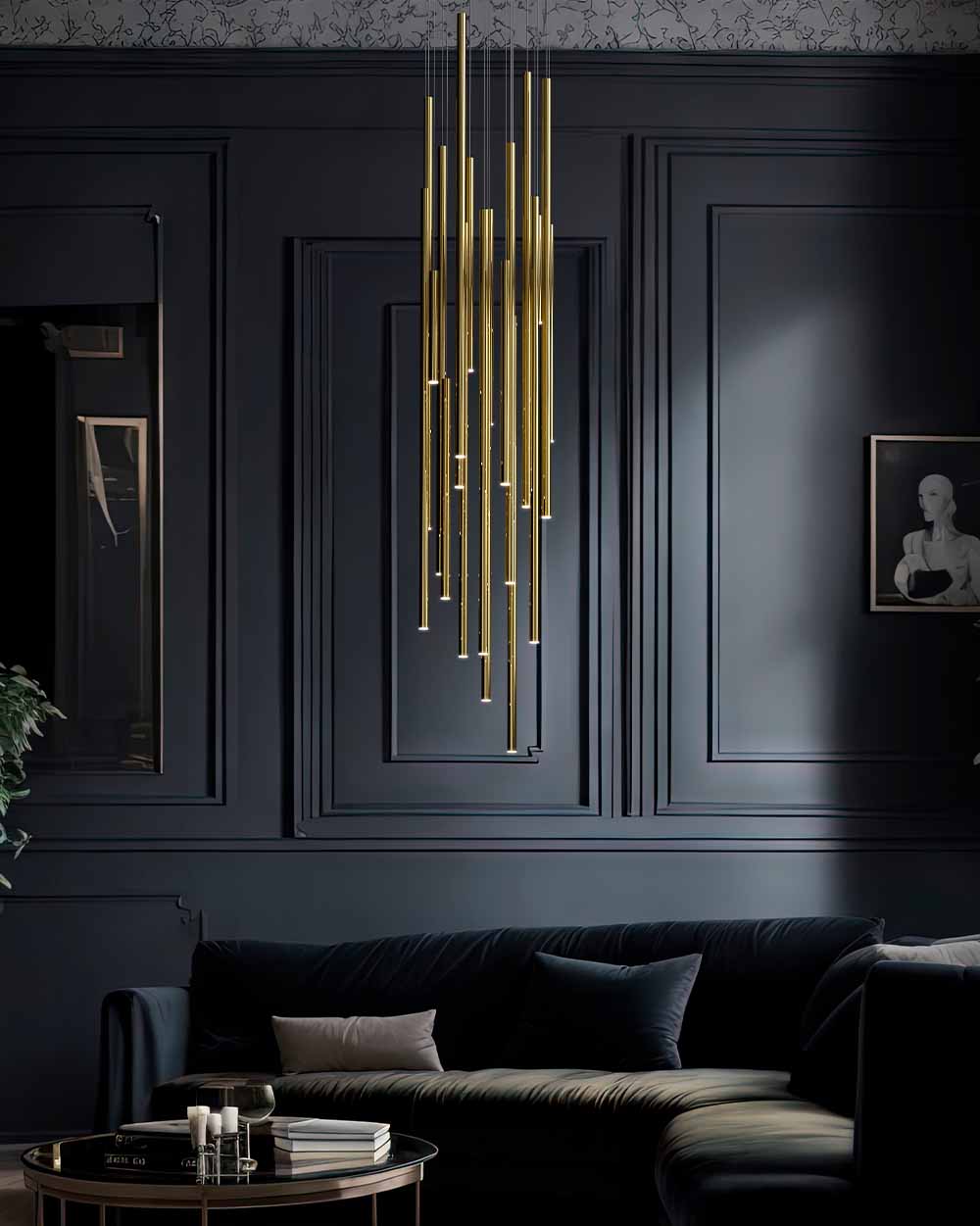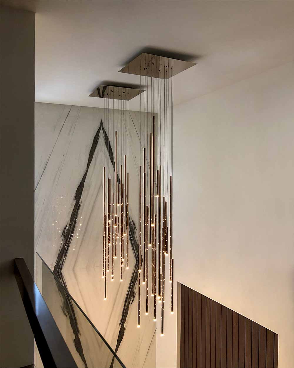A majestic and imposing lighting design. A shower of rods of different sizes dresses up high-ceilinged environments. With its versatility and multiple configurations, both in the